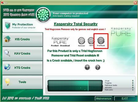 Hiện tại vì chưa tìm key được cho Kaspersky PURE nên tạm thời bạn dùng phần mềm Trial Reset kéo dài thời gian dùng thử Kaspersky PURE.